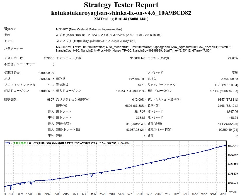 NZDJPYは証拠金50万円では長期バックテストでロスカットになりましたので、証拠金100万円での結果になります。