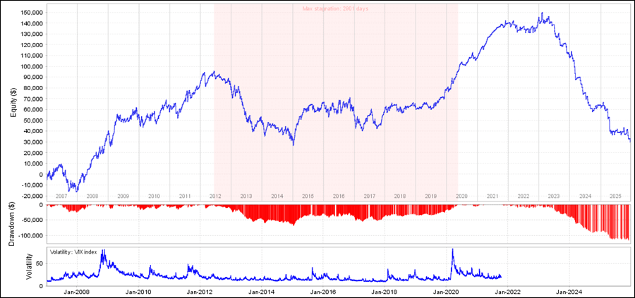 KUNAI_USDJPYをQuantAnalyzerで見てみると、2012年から成績が落ちて長い停滞期があるのがわかります。また、直近も成績が落ちています。