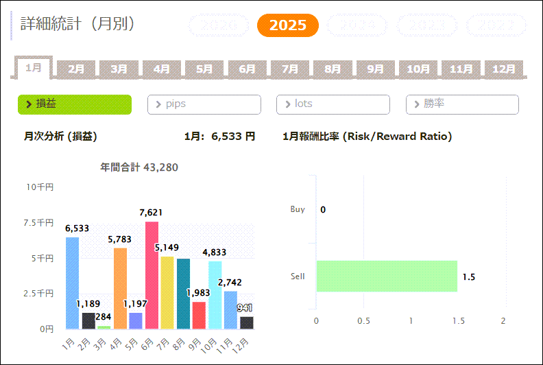| 平均利益 | 1,108円 | 最大利益 | 17,295円 |