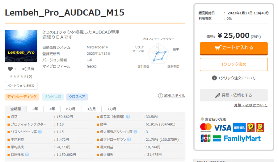 Lembeh_Pro_AUDCAD_M15は公開成績を見ると、2023年1月17日リリースから利益を積み重ねています。