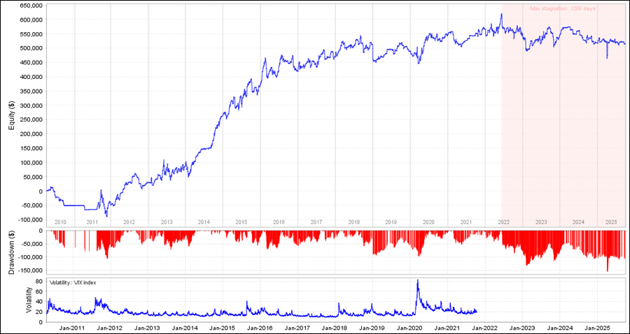 Lembeh_Pro_AUDCAD_M15をQuantAnalyzerで見てみると、全体的には利益を積み上げていますが、直近の2022年、2023年がマイナスです。