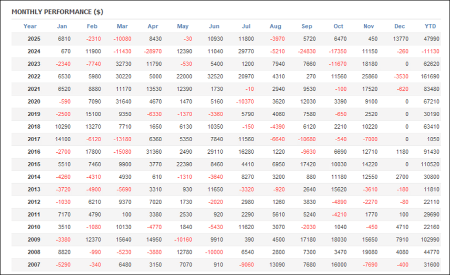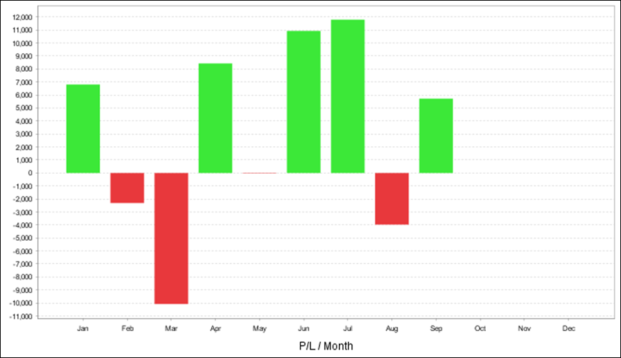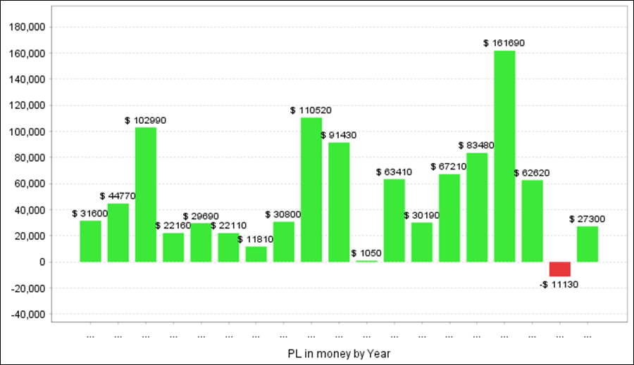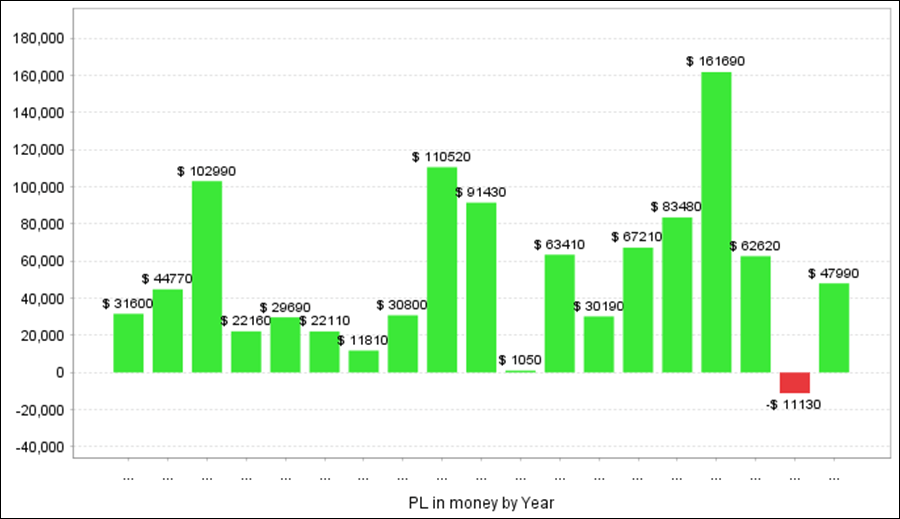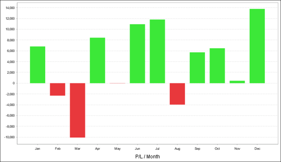 年次・月次の成績、年次の損益グラフ