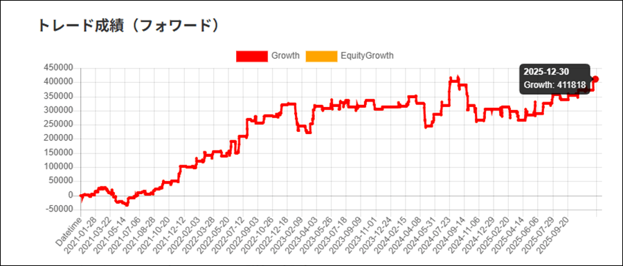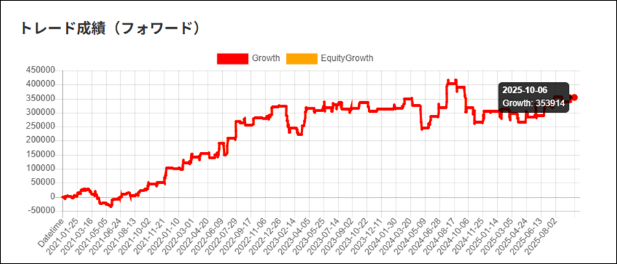 「バックテスト結果とフォワードテスト結果が違いないか」、「過去データに最適化し過ぎていないか」など参考にしてください。