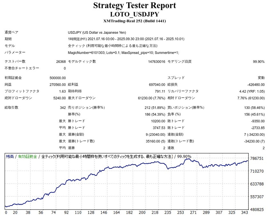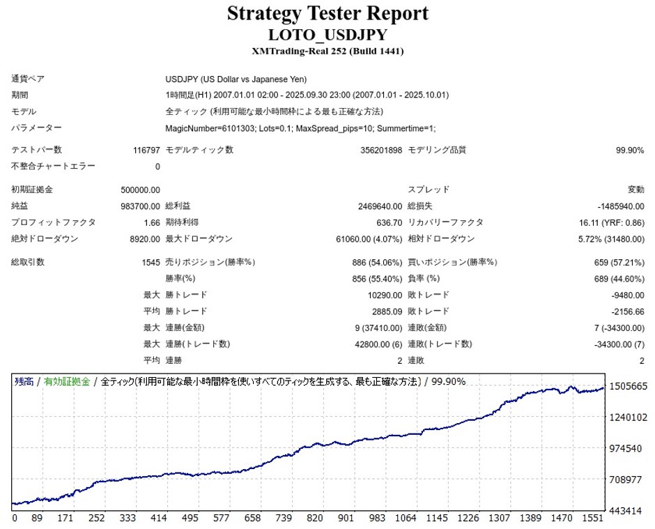 LOTO_USDJPY_EB01のバックテストをしてきました。バックテスト結果は良好で、リリース後の成績も良さそうです。