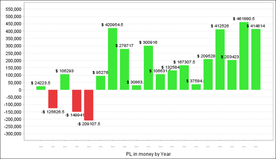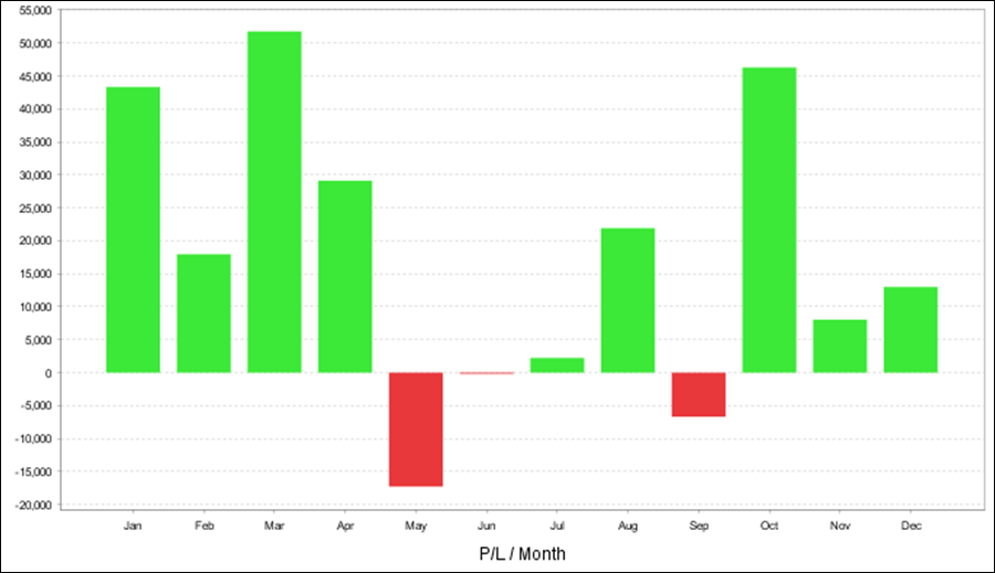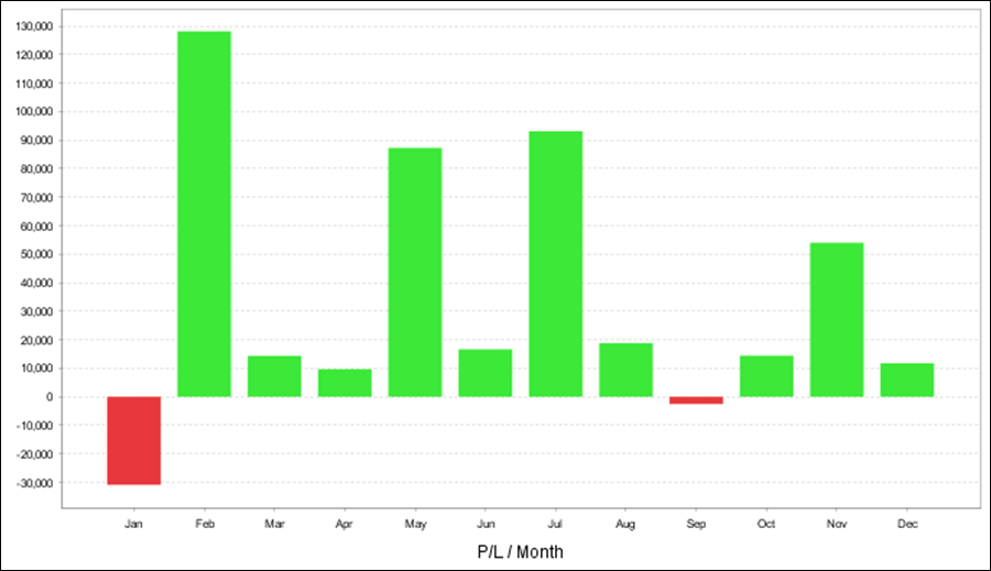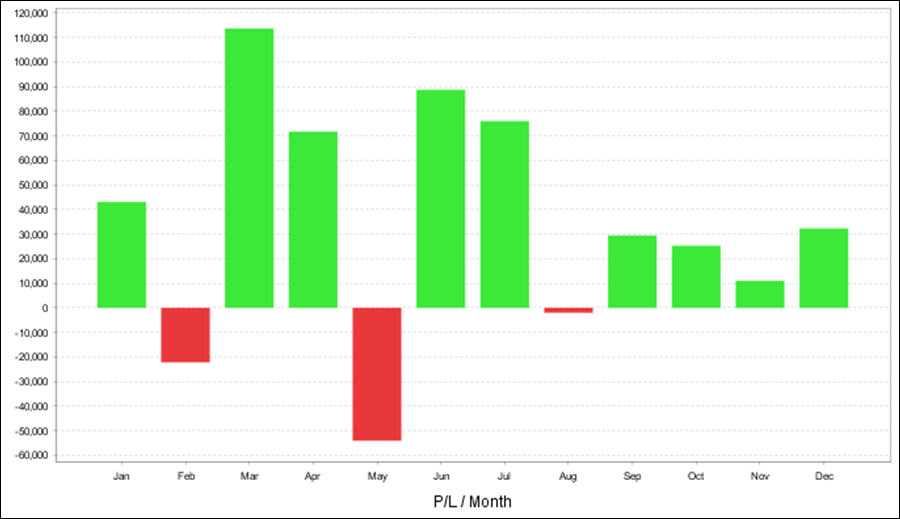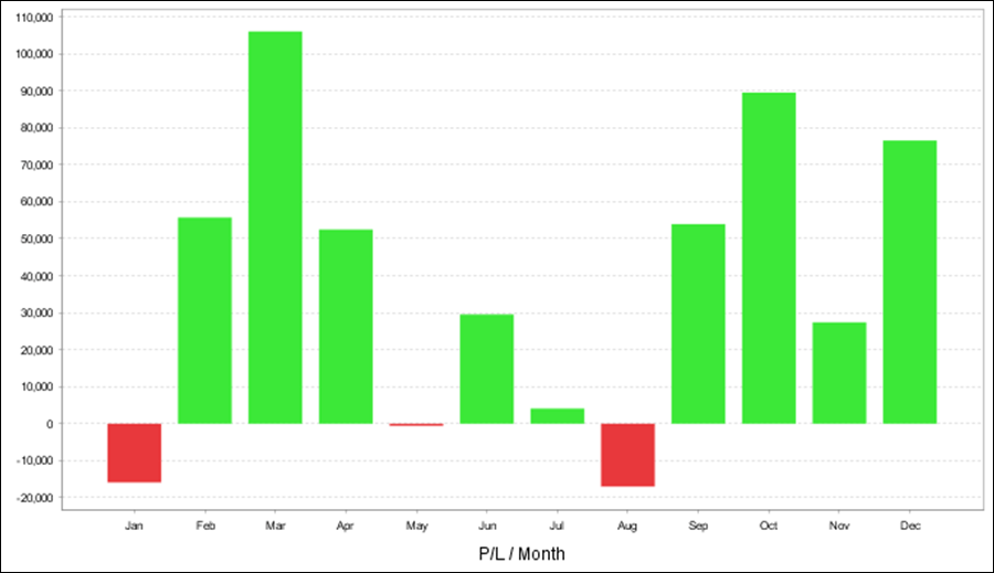 QuantAnalyzerを使った年次・月次の成績となります。2008年、2010年、2011年以外は全てプラス成績です。