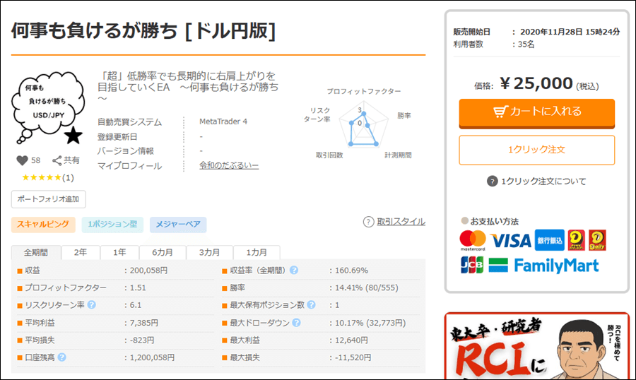 何事も負けるが勝ち [ドル円版]は超低勝率EAのようですが、成績はどうなのでしょうか。