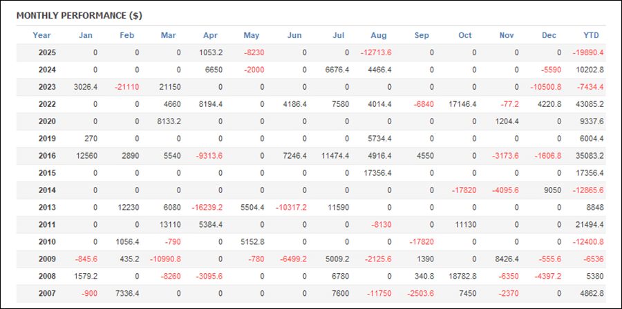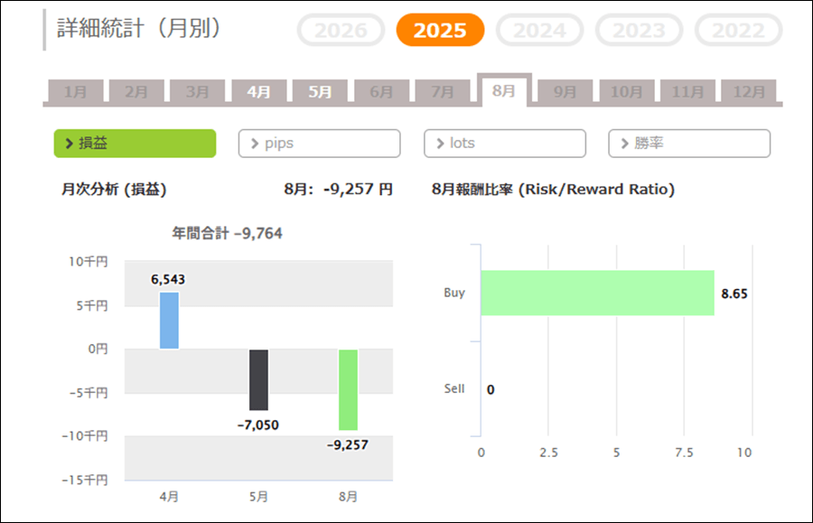 月次分析を見ると、2025年はトータルでマイナスです。2024年は取引のない月もありますが、トータルでプラスです。2023年は4月~11月までは取引がされていないようです。2022年はプラスの月が多いです。