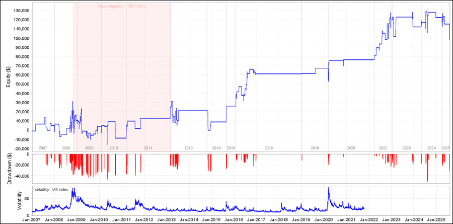 • 下方の赤色のグラフ:ドローダウン(山が大きいとドローダウンが大きい)