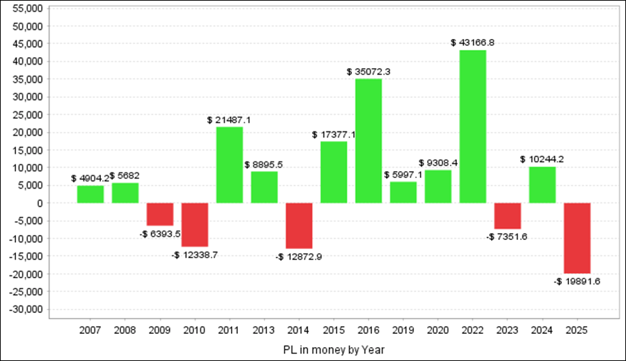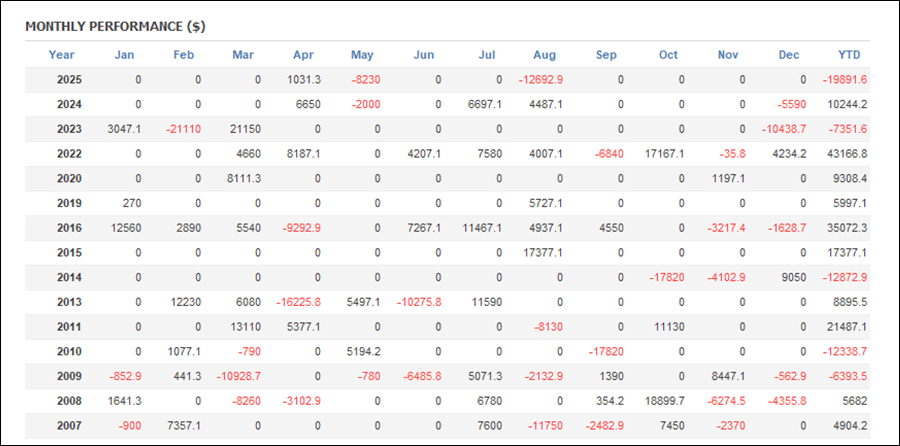 月次分析を見ると、2025年は今のところトータルでマイナスです。2024年は取引のない月もありますが、トータルでプラスです。2023年は4月~11月までは取引がされていないようです。2022年はプラスの月が多いです。