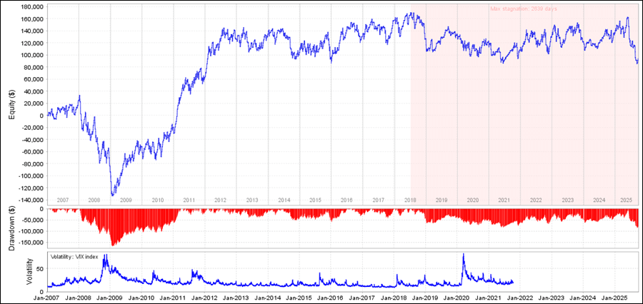• 下方の赤色のグラフ:ドローダウン(山が大きいとドローダウンが大きい)