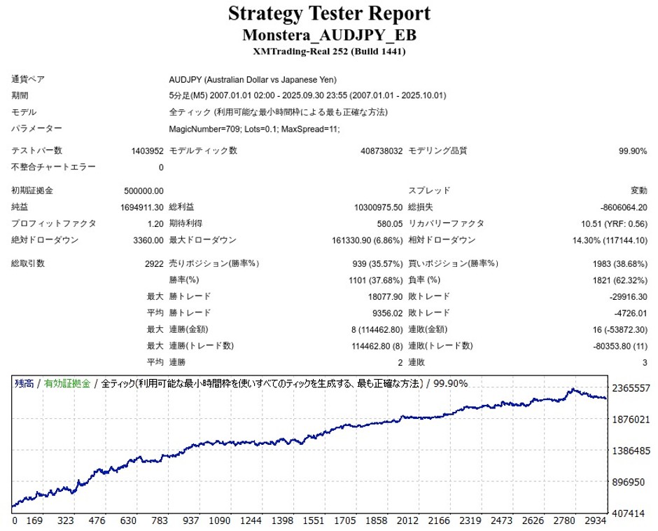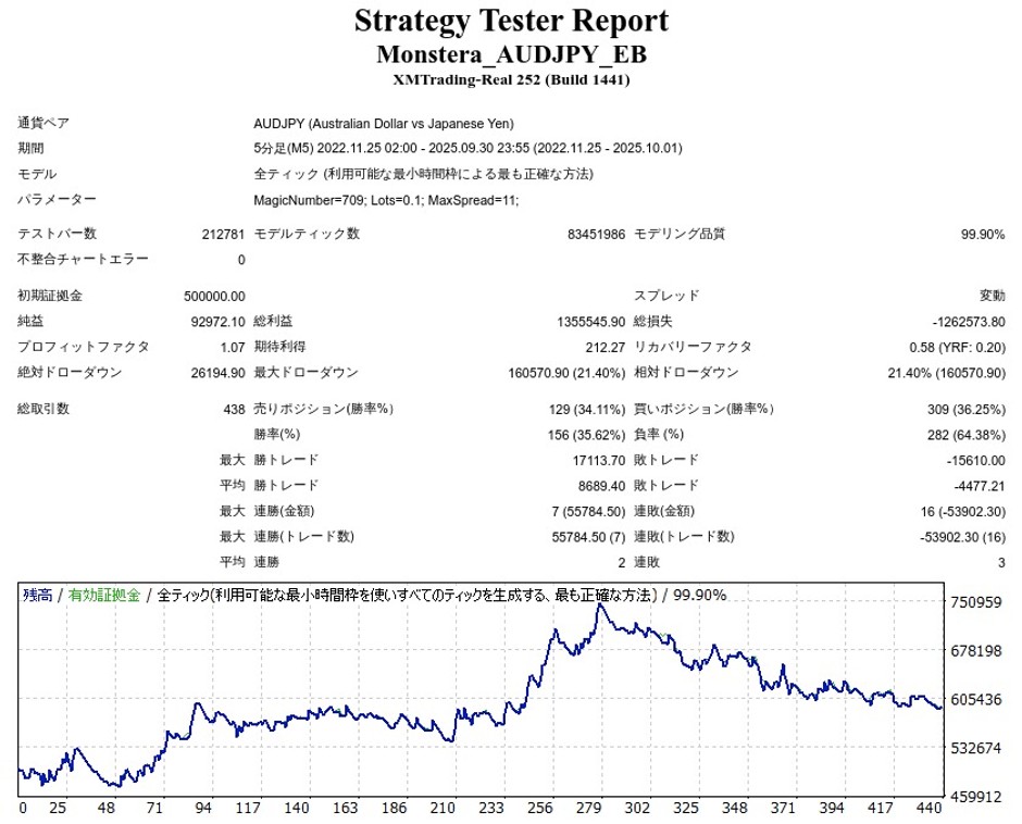 Monstera_AUDJPY_EBのリリース後のバックテスト結果(≒フォワード結果)は以下のようになりました。