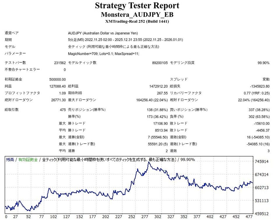 Monstera_AUDJPY_EBのリリース後のバックテスト結果(≒フォワード結果)は以下のようになりました。