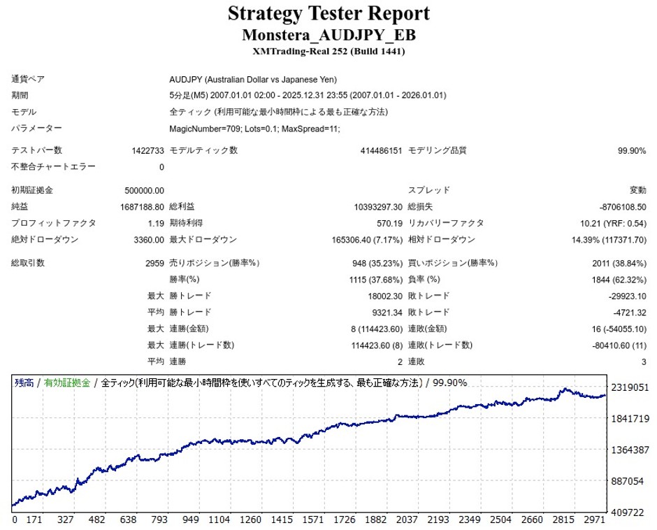 EA-BANKで提供されているEA「Monstera_AUDJPY_EB」をTDS(Tick Data Suite)を使ってバックテストを行ったので、結果を紹介して行きます。