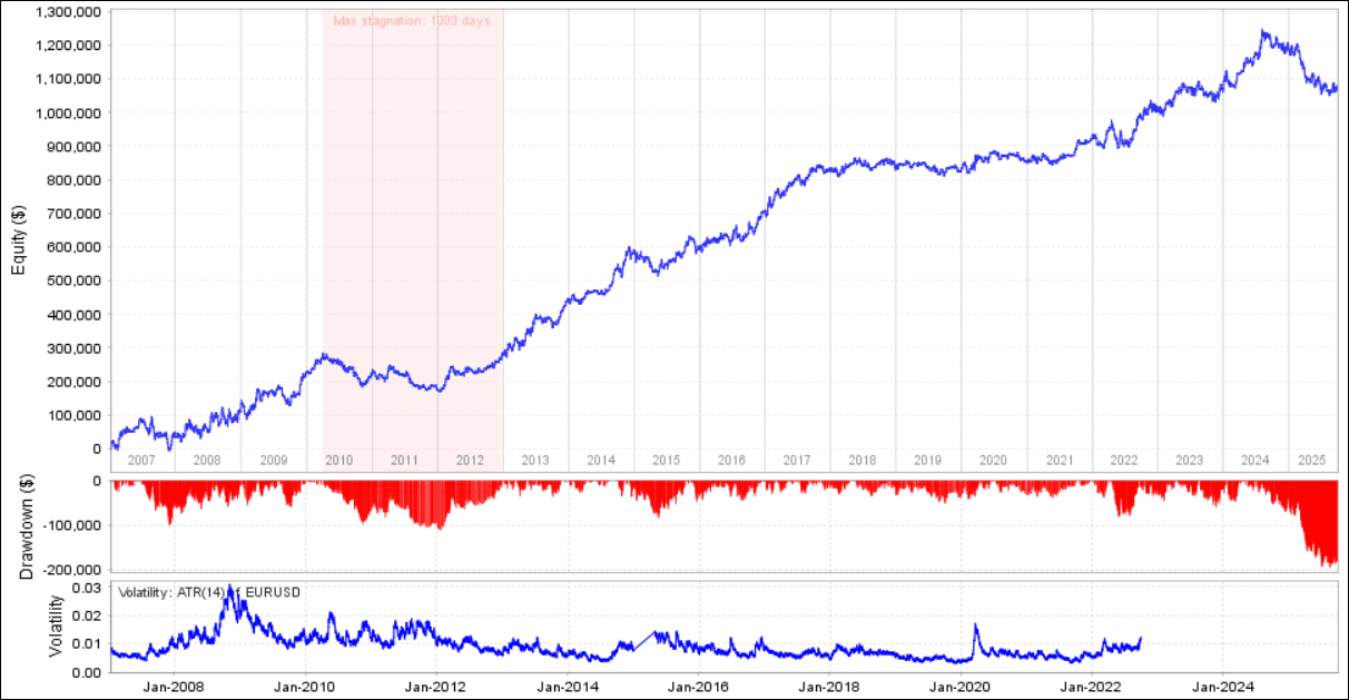 - 下方の赤色のグラフ:ドローダウン(山が大きいとドローダウンが大きい)