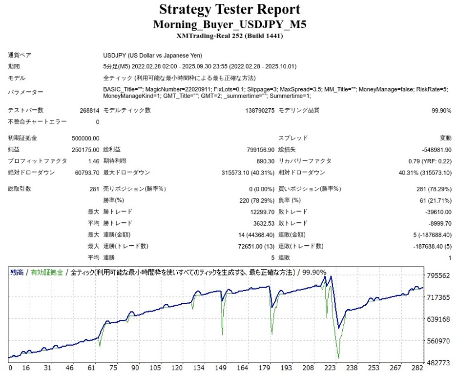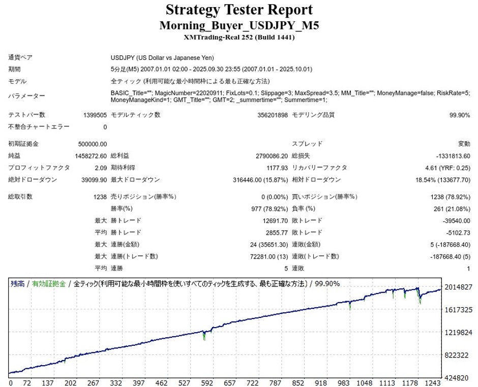 モーニング・バイヤーの初期ロットは0.2ロットですが、バックテストは0.1ロットで行ったところ、なかなか良い成績でした。