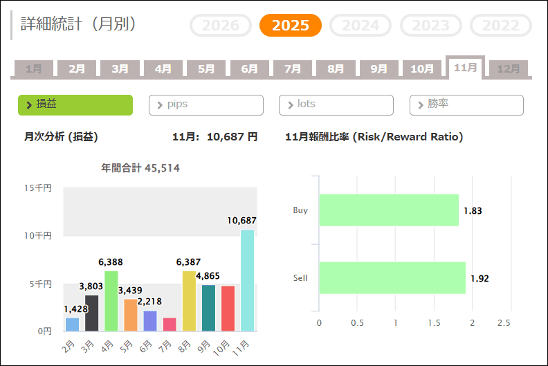 2022年~2025年の月間成績をまとめると合計で+0.5万円の成績となりました。