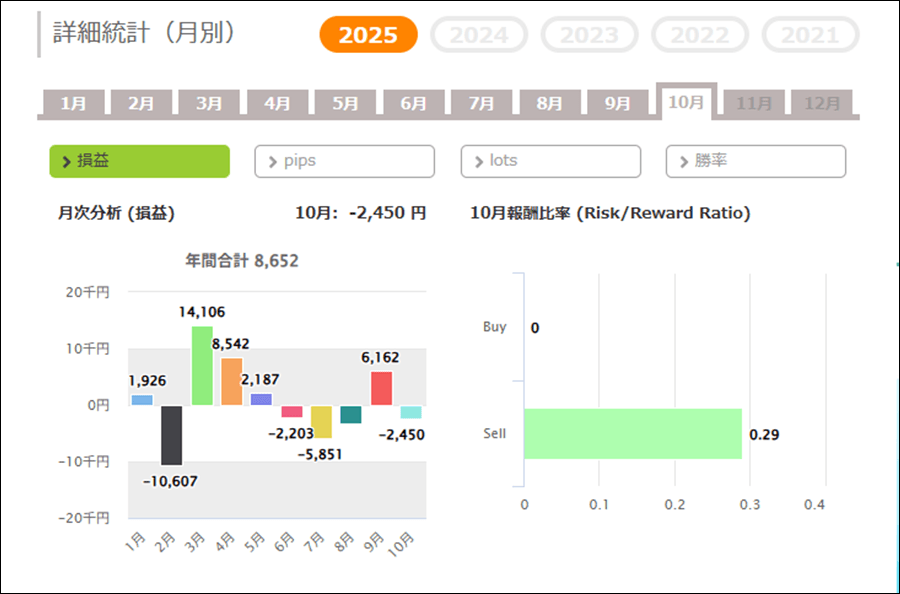 平均利益 | 1,304円 | 最大利益 | 8,610円 |