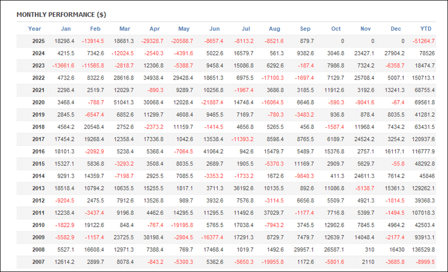 年間成績は2007年以外はずっとプラスでしたが、2025年はマイナスになっています。