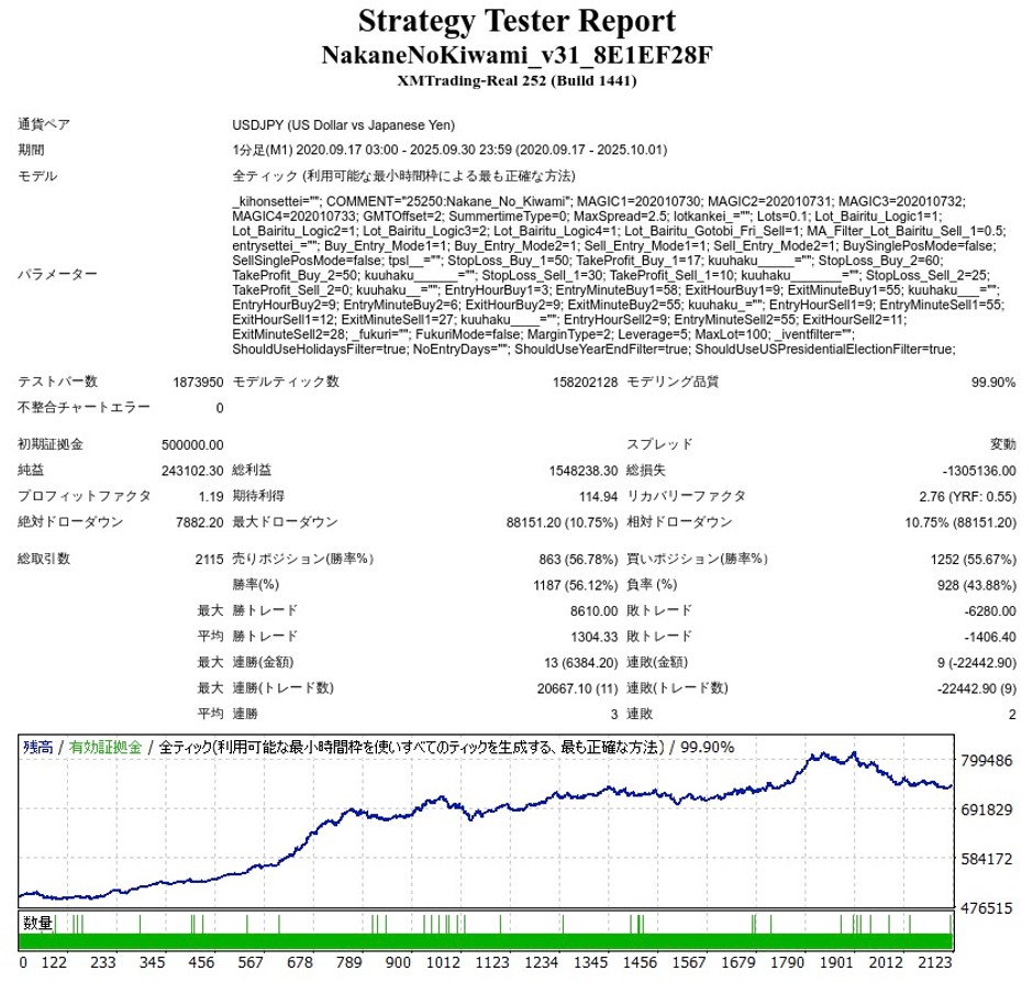 バックテストではXMの環境で行いましたので、最大スプレッドが初期値1.5のところ、2.0に変更して検証しています。