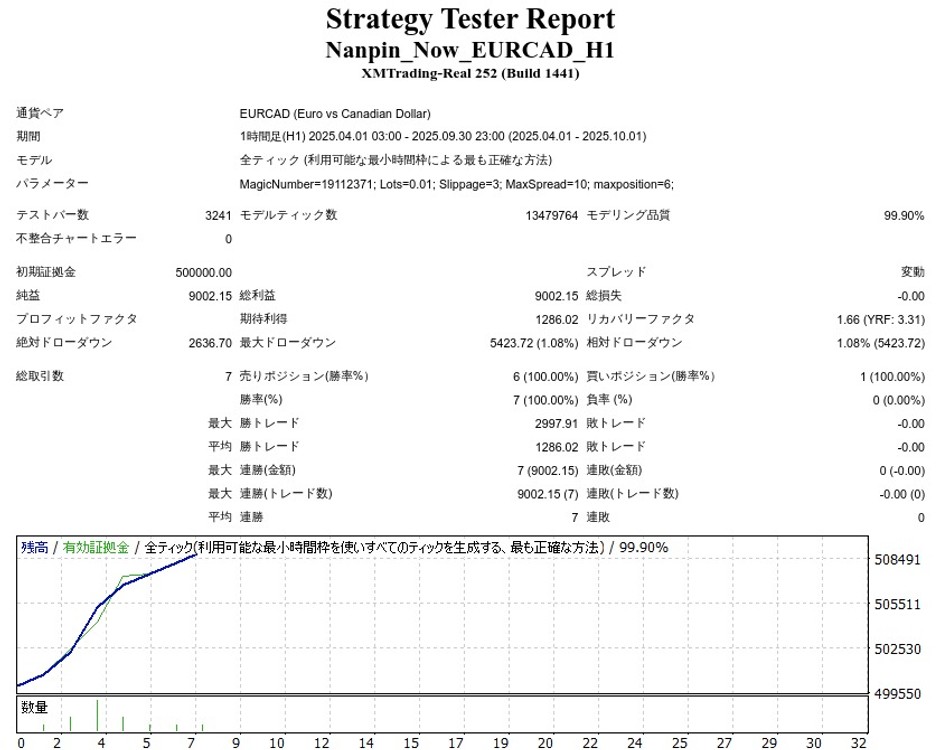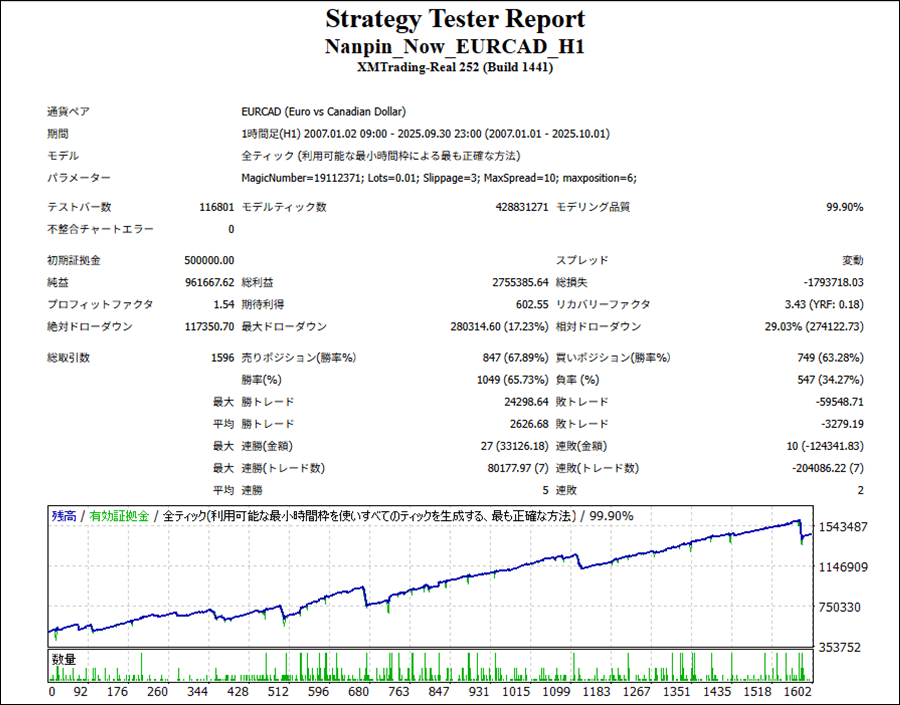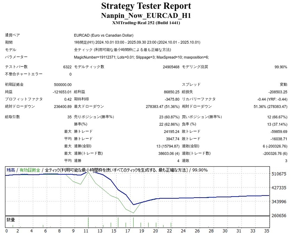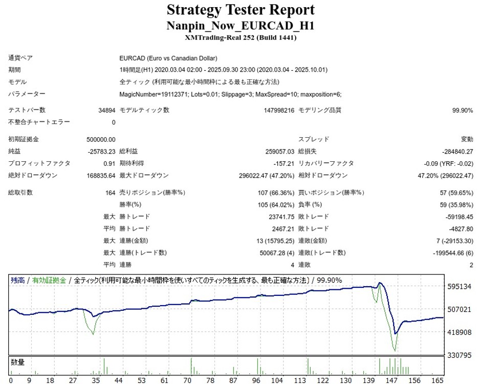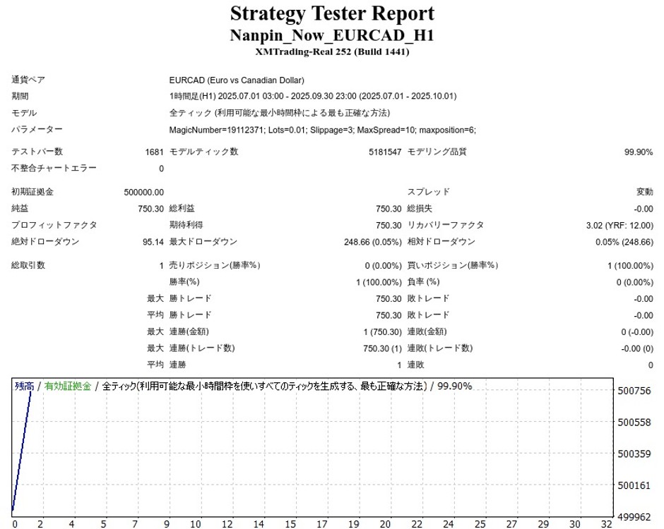 Nanpin_Now_EURCADのリリース後のバックテスト結果(≒フォワード結果)は以下のようになりました。