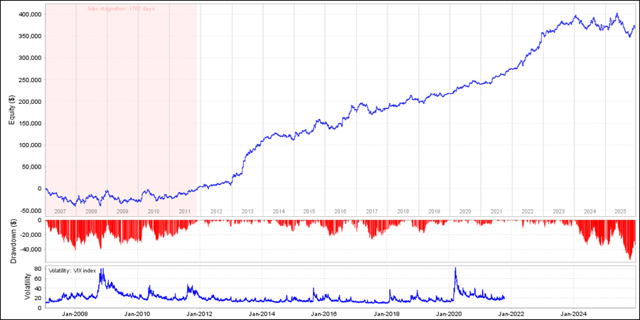 QuantAnalyzerを使った年次・月次の成績となります。2007年と2009年、2024年、2025年がマイナスで、それ以外はプラス成績です。