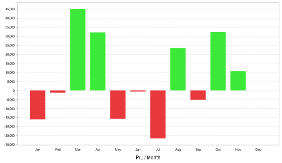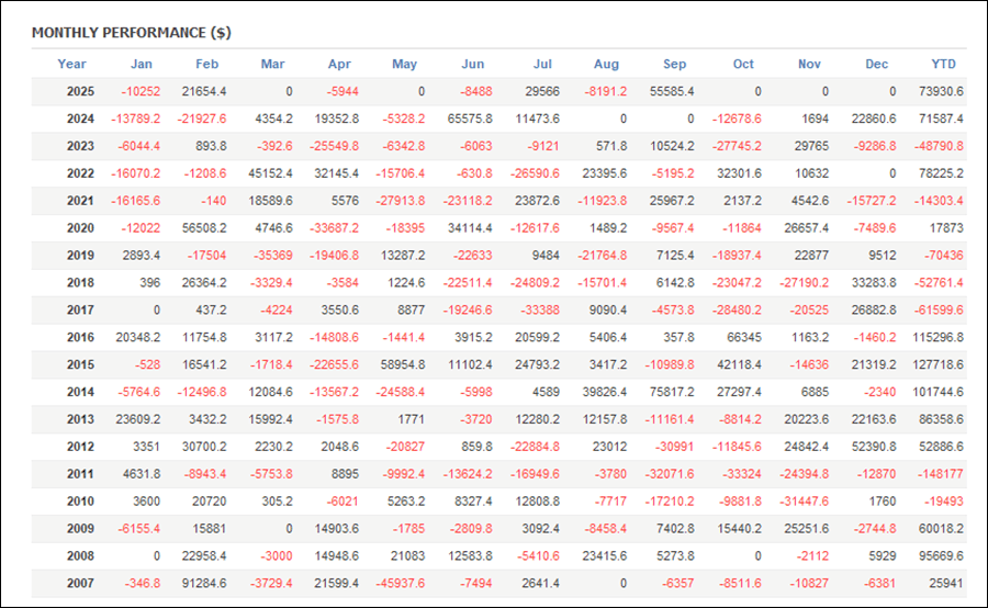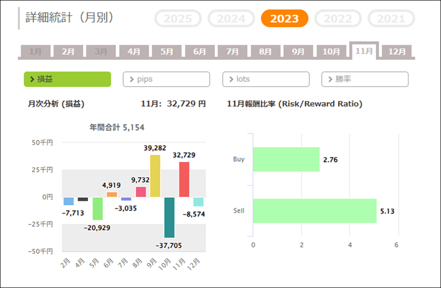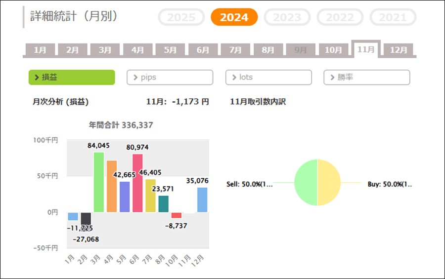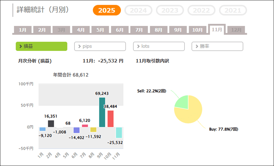 月次分析を見ると、マイナスの月もありますがトータルではプラスになっています。2025年はマイナスが多めです。