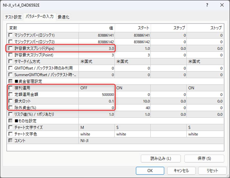 デフォルトでは複利運用がONになっていますが、検証ではOFFにして固定0.1ロットに近づくように設定しています。