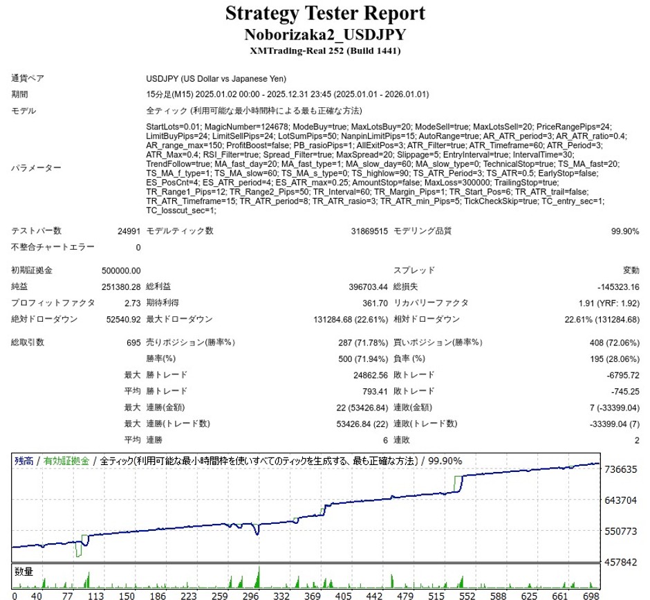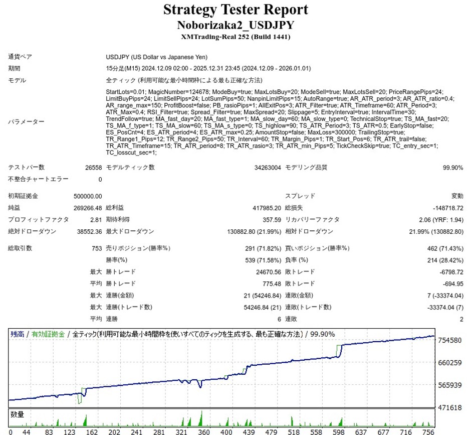 変動スプレッドON、スリッページONにして、できるだけリアルに近い環境でテストしています。
