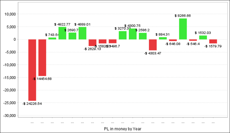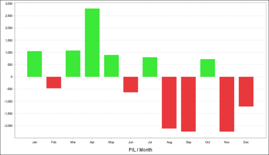 QuantAnalyzerを使った年次・月次の成績となります。2007年、2008年の損失が大きく、その後はプラスの年が多くなっています。
