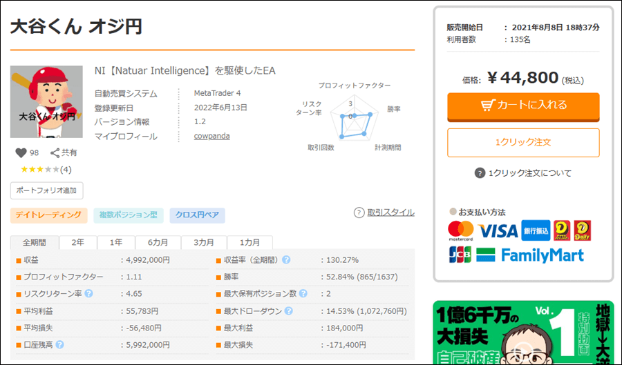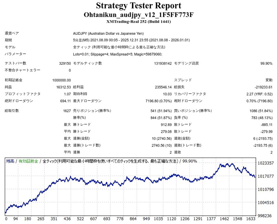 | 初期証拠金 | 1,000,000円 | 勝率 | 51.87% |