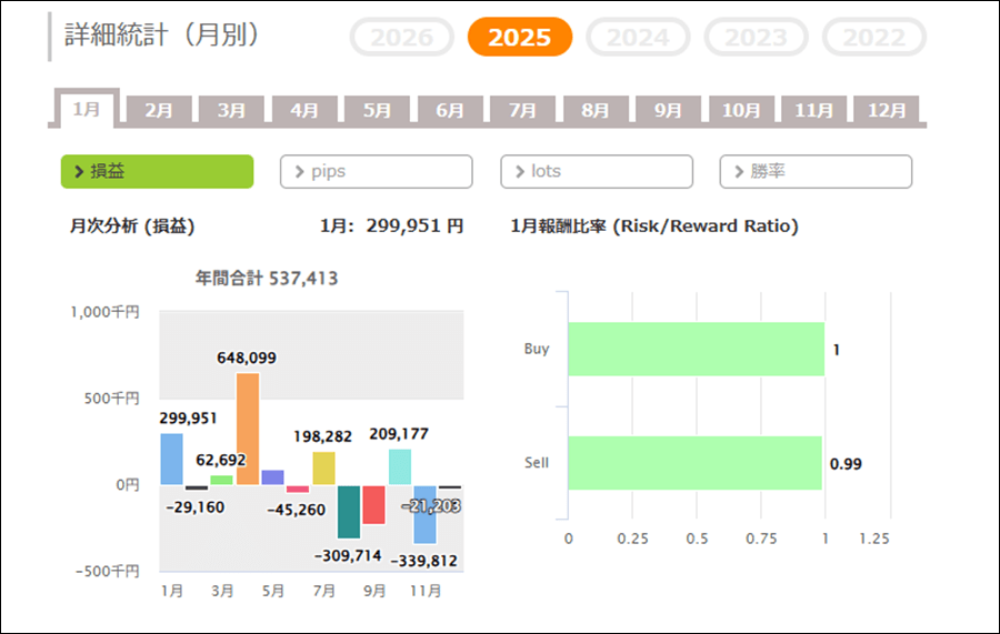 月次分析を見ると、2025年は4月に大きくプラスでトータルでプラスです。