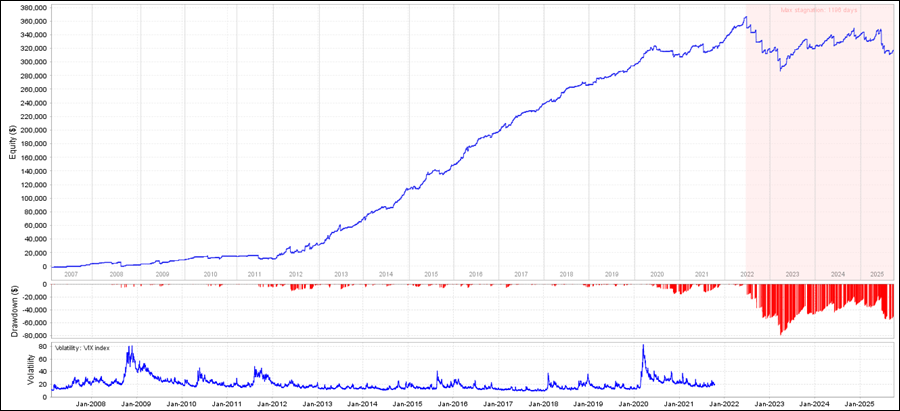 Panda-C_PRO_USDJPY_M15をQuantAnalyzerで見てみると、直近の成績は停滞していますが、それまでは右肩あがりの成績となっています。
