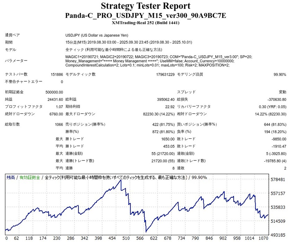 Panda-C_PRO_USDJPY_M15はスプレッドが狭い業者推奨です。検証用に使っているXM環境では許容スプレッドが「10」では全くエントリーしませんので、設定を「20(2pips)」にして、単利設定、0.1Lotで検証しています。
