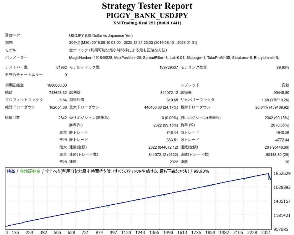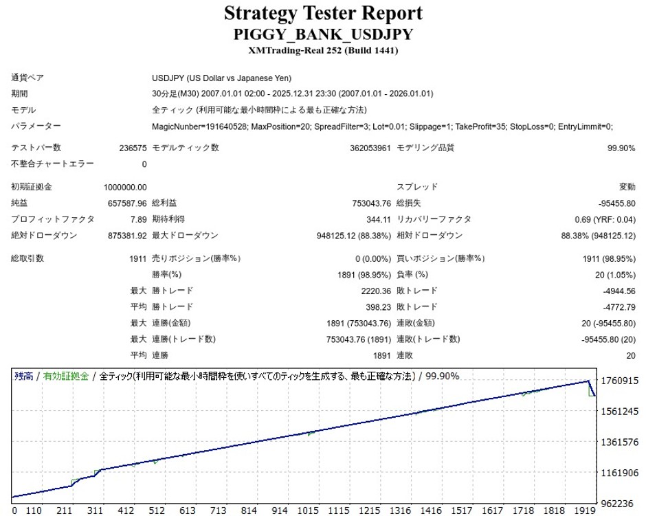 | 初期証拠金 | 1,000,000円 | 勝率 | 98.95% |