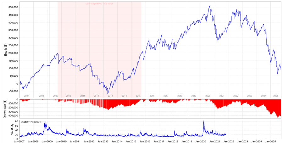 Pips_miner_EAをQuantAnalyzerで見てみると、長期ではプラスですが2009年~2015年あたりが停滞しています。