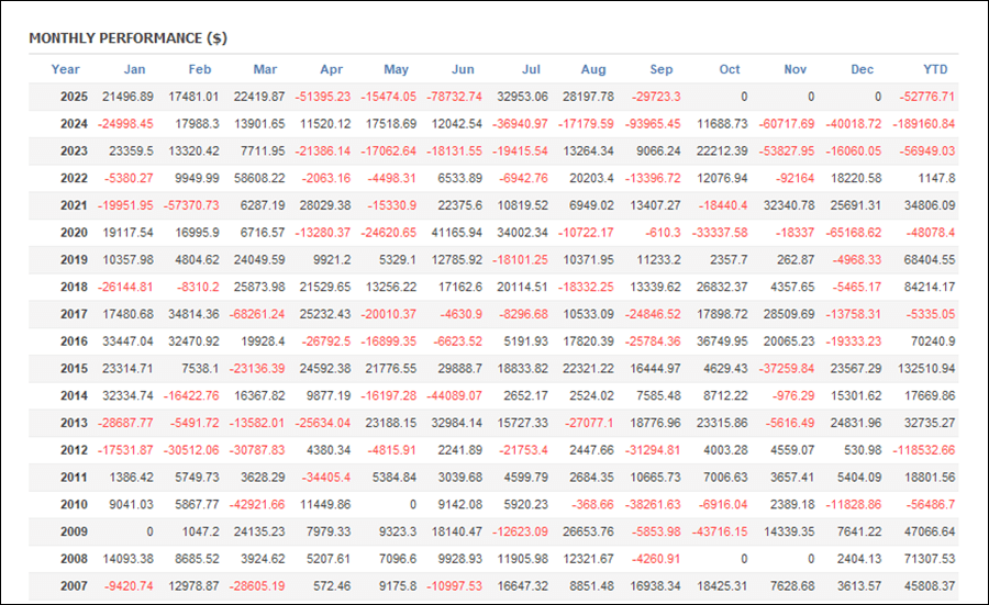 一番右側(YTD)の年次成績では負けた年も4回ほどありますが、比較的順調な成績となりました。