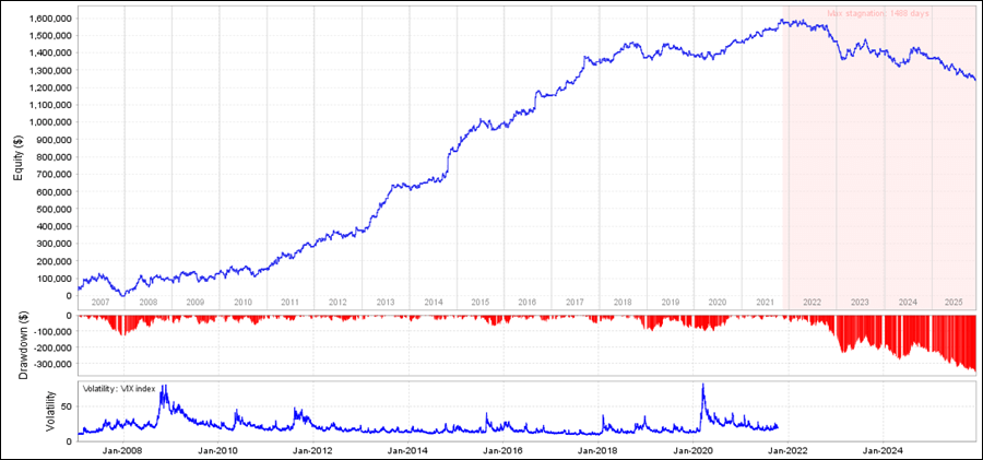Profit Capture Plan-BをQuantAnalyzerで見てみると、全体的に右肩上がりで推移していますが、直近の成績が落ちています。
