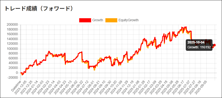 「バックテスト結果とフォワードテスト結果が違いないか」、「過去データに最適化し過ぎていないか」など参考にしてください。