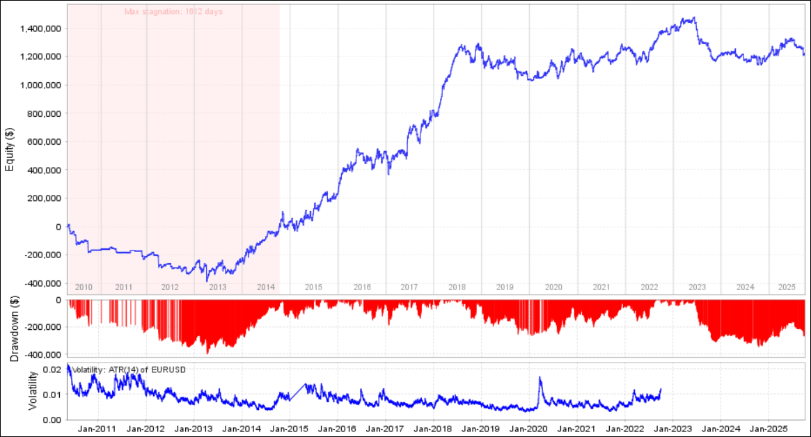 • 下方の赤色のグラフ:ドローダウン(山が大きいとドローダウンが大きい)