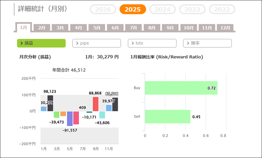 月次分析を見ると、2025年はトータルでプラスです。2024年は順調に利益が出ています