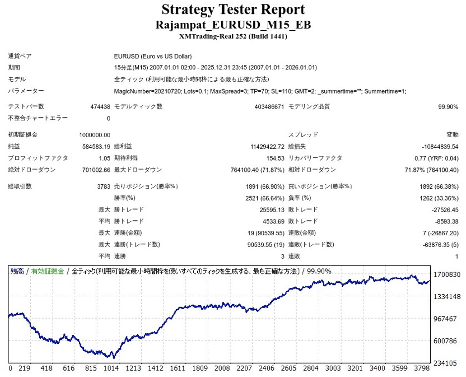 Rajampat_EURUSD_M15は証拠金50万円ではロスカットになったため、100万円で検証した結果となります。