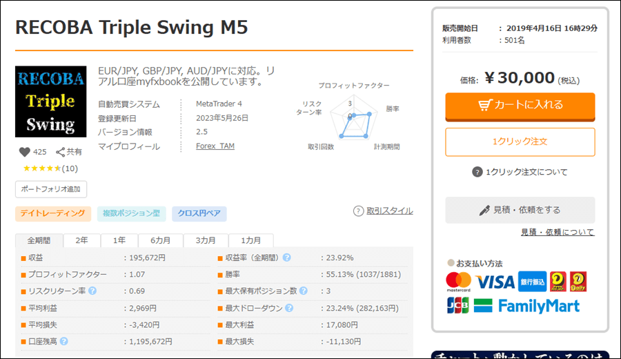 RECOBA Triple Swing M5はスイング・デイトレEAのようですが、成績はどうなのでしょうか。
