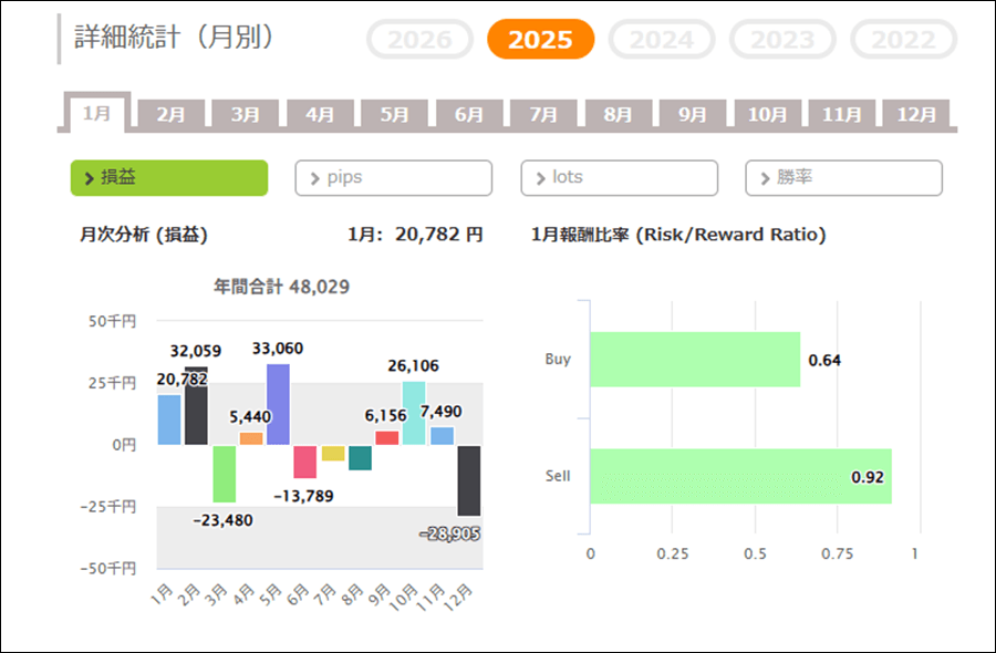 月間の取引回数は1ヶ月に25回前後で、週4くらいのペースで取引がありますね。