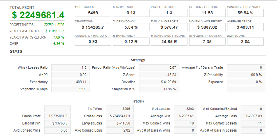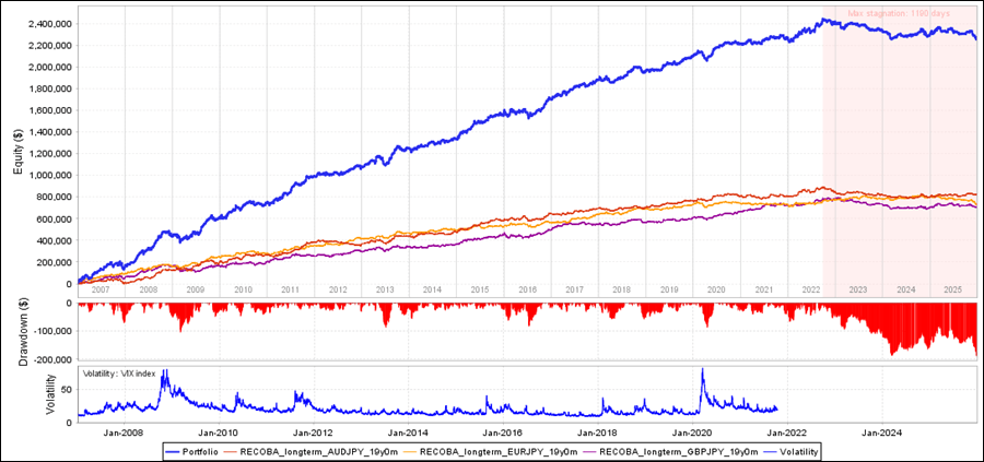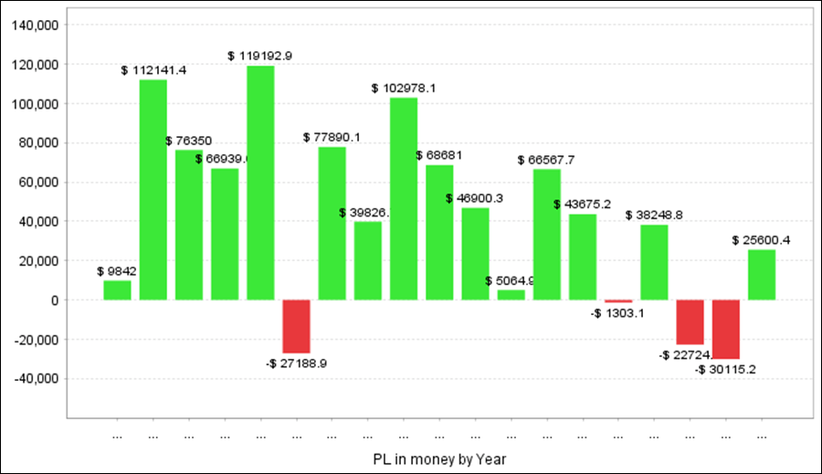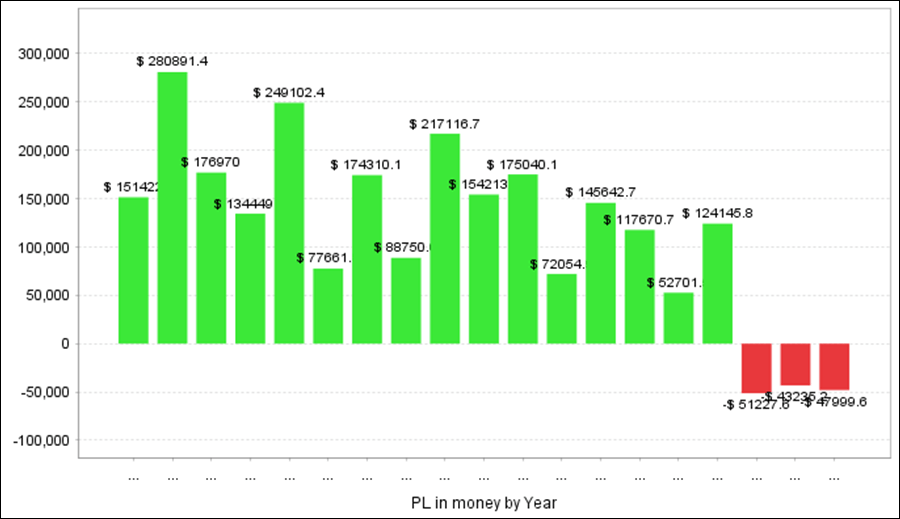 QuantAnalyzerを使って3通貨ペアを合計すると、過去18年間で+224.9万円の収益となりました。