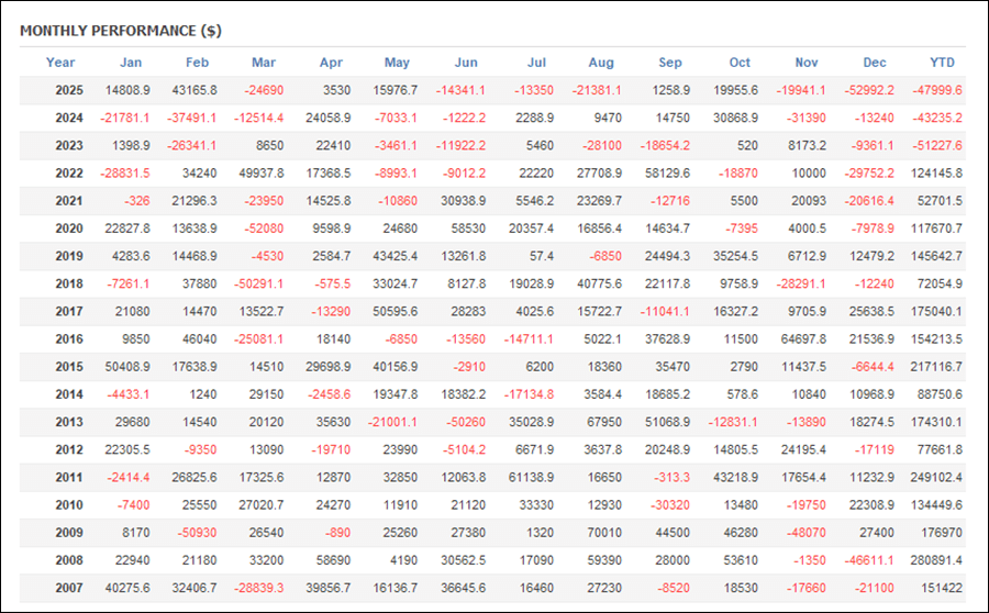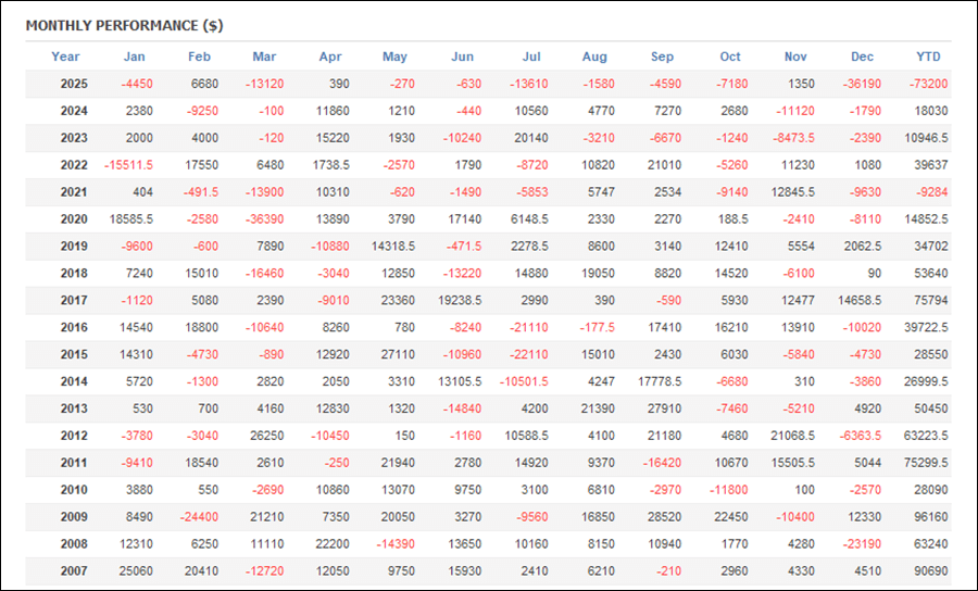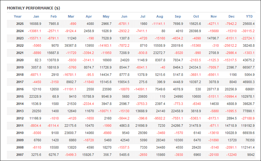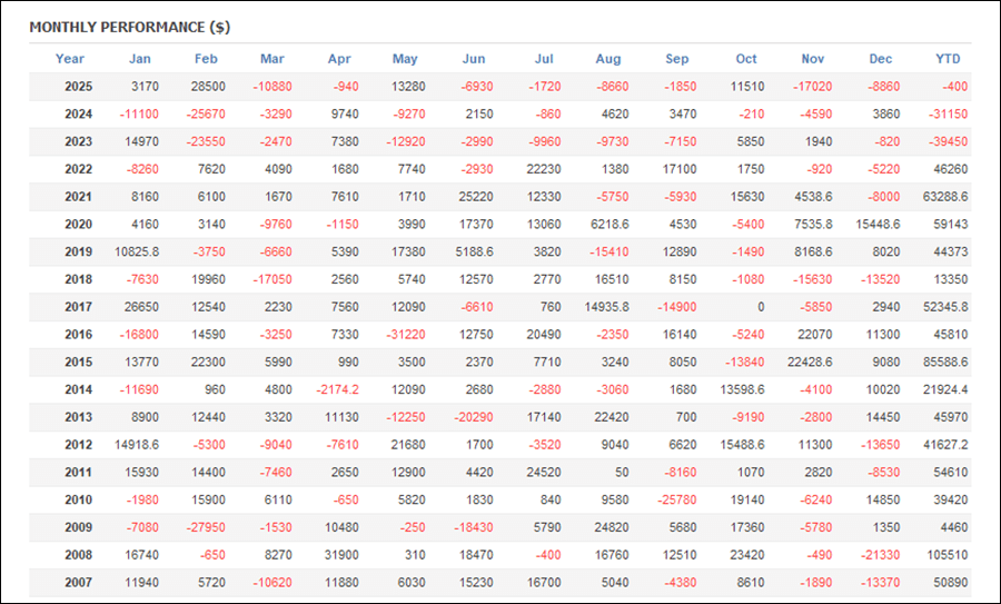 年次成績は直近の2023年、2024年、2025年以外は全てプラスとなっています。