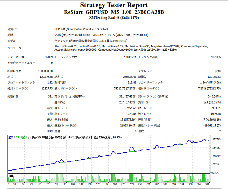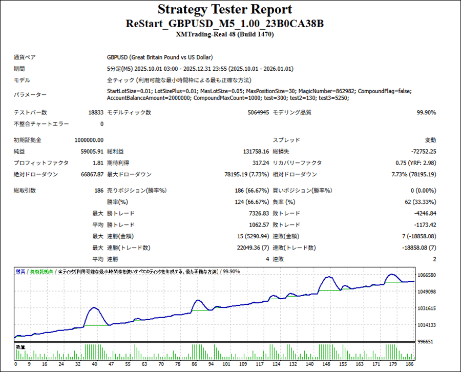 | 初期証拠金 | 1,000,000円 | 勝率 | 67.45% |