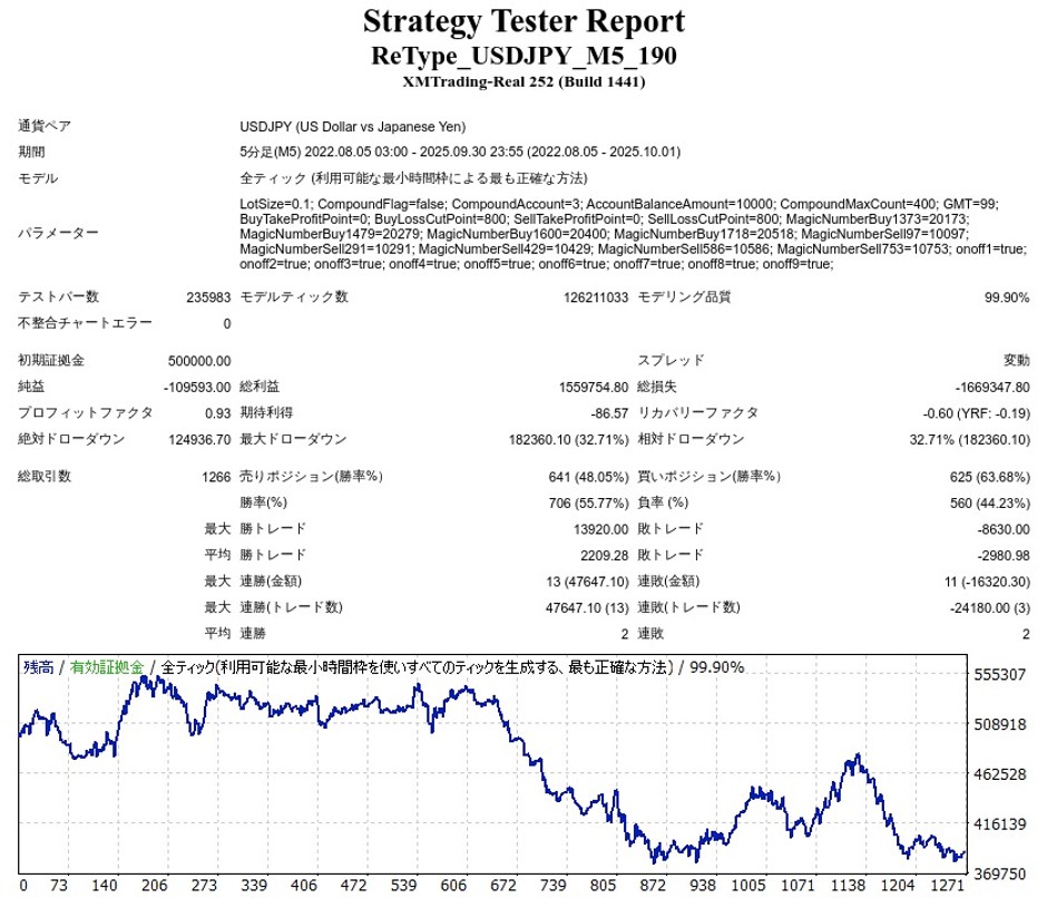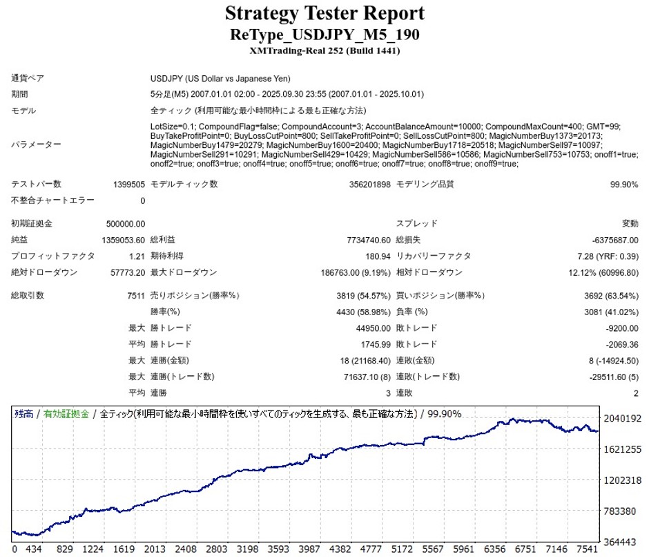 初期設定で複利機能がONのため、ロット数が大きく平均利益や損失も大きくなっているようです。