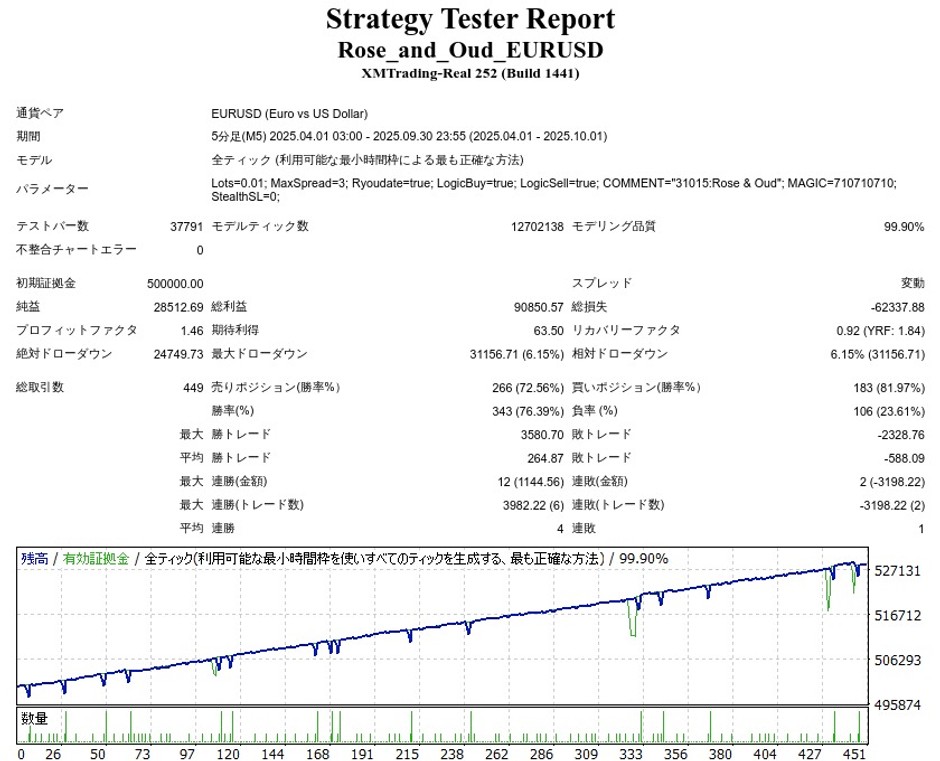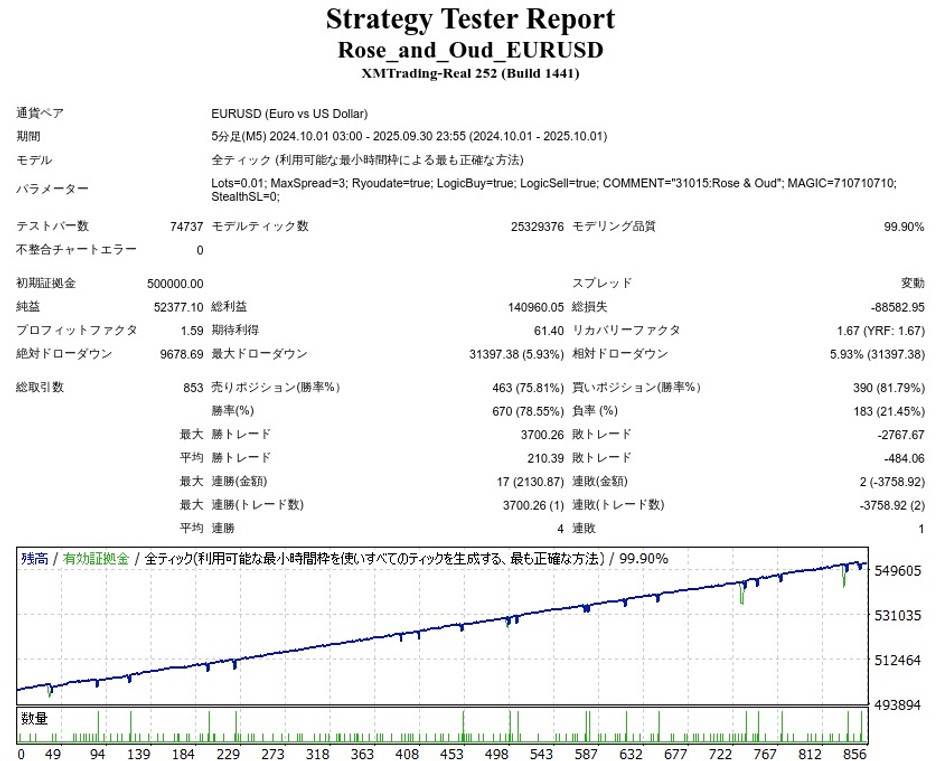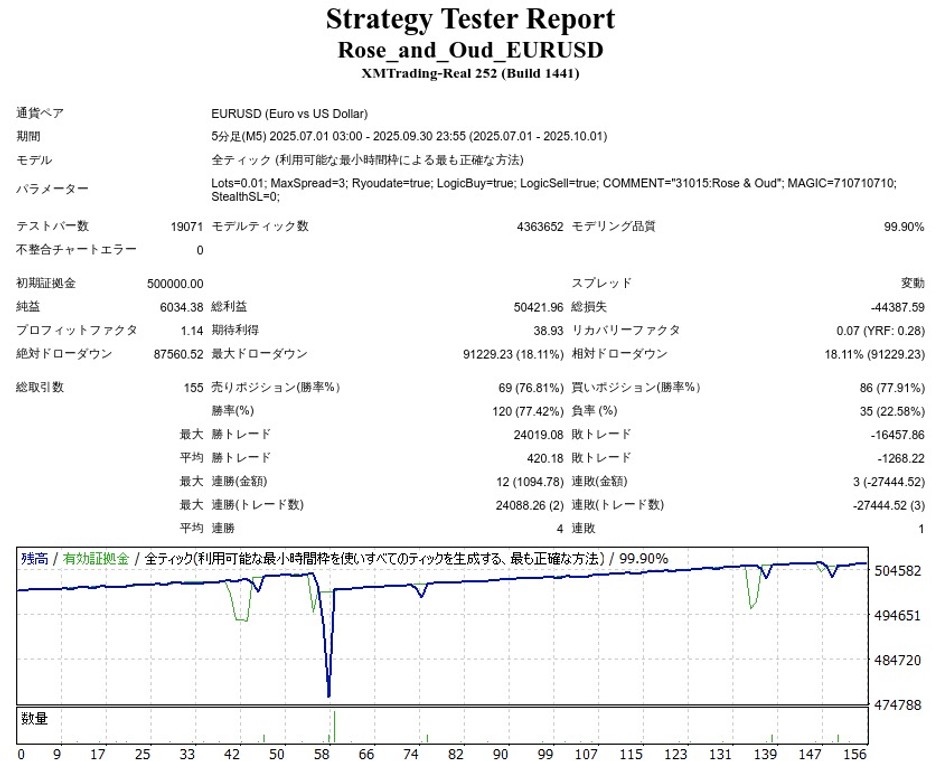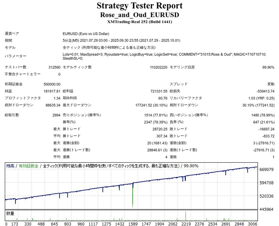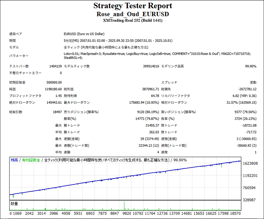 Rose & Oud EURUSDのリリース後のバックテスト結果(≒フォワード結果)は以下のようになりました。