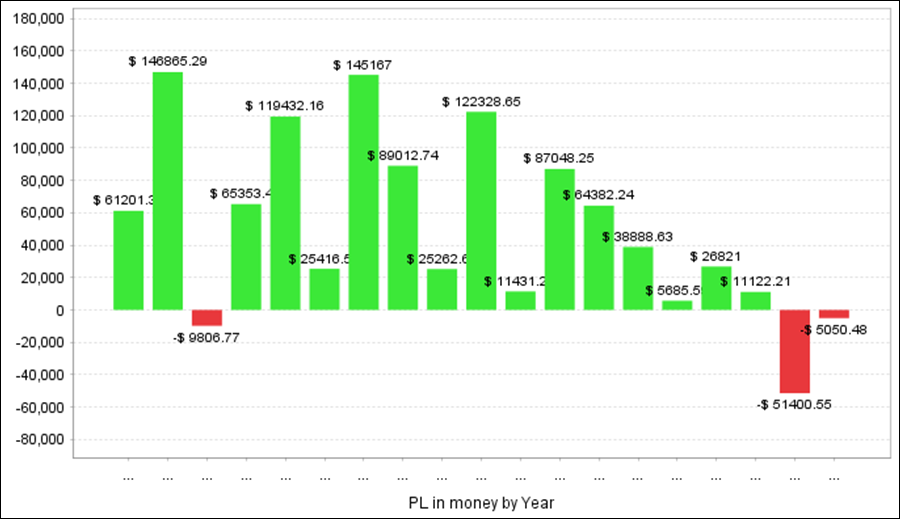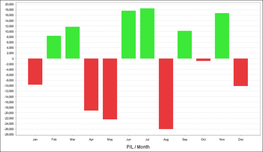 年次・月次の成績、年次の損益グラフ