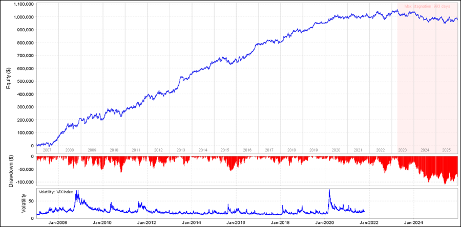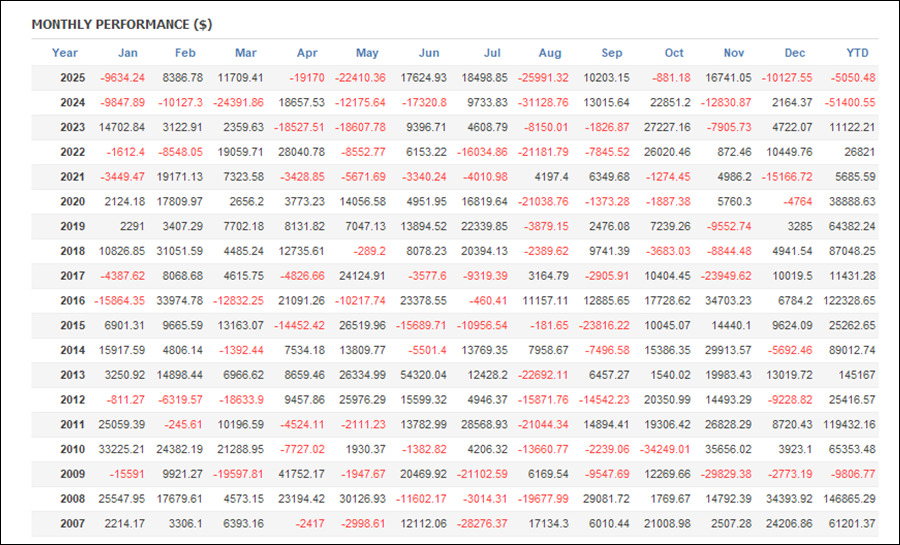 QuantAnalyzerを使った年間成績は、2009年以外はずっとプラスでしたが、2024年、2025年がマイナスになっています。